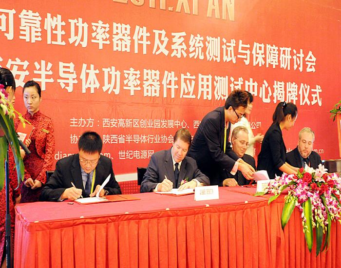 2011年11月16日,西安功率器件測(cè)試應(yīng)用中心揭牌儀式及“高可靠性功率器件及系統(tǒng)的測(cè)試與保障”研討會(huì)在西安香格里拉大酒店舉行,國(guó)際、國(guó)內(nèi)著名的半導(dǎo)體行業(yè)及半導(dǎo)體企業(yè)的高層領(lǐng)導(dǎo)和專家、學(xué)者齊聚一堂,共同探討功率器件和應(yīng)用系統(tǒng)測(cè)試技術(shù)和發(fā)展動(dòng)態(tài)。會(huì)上,舉行了西安功率器件測(cè)試應(yīng)用中心正式揭牌儀式,和STI、ITC、QUALMARK合作實(shí)驗(yàn)室的簽約儀式,并和西安交通大學(xué)、西北工業(yè)大學(xué)、西安電子科技大學(xué)、西安理工學(xué)院等八家院校簽訂了合作協(xié)議。