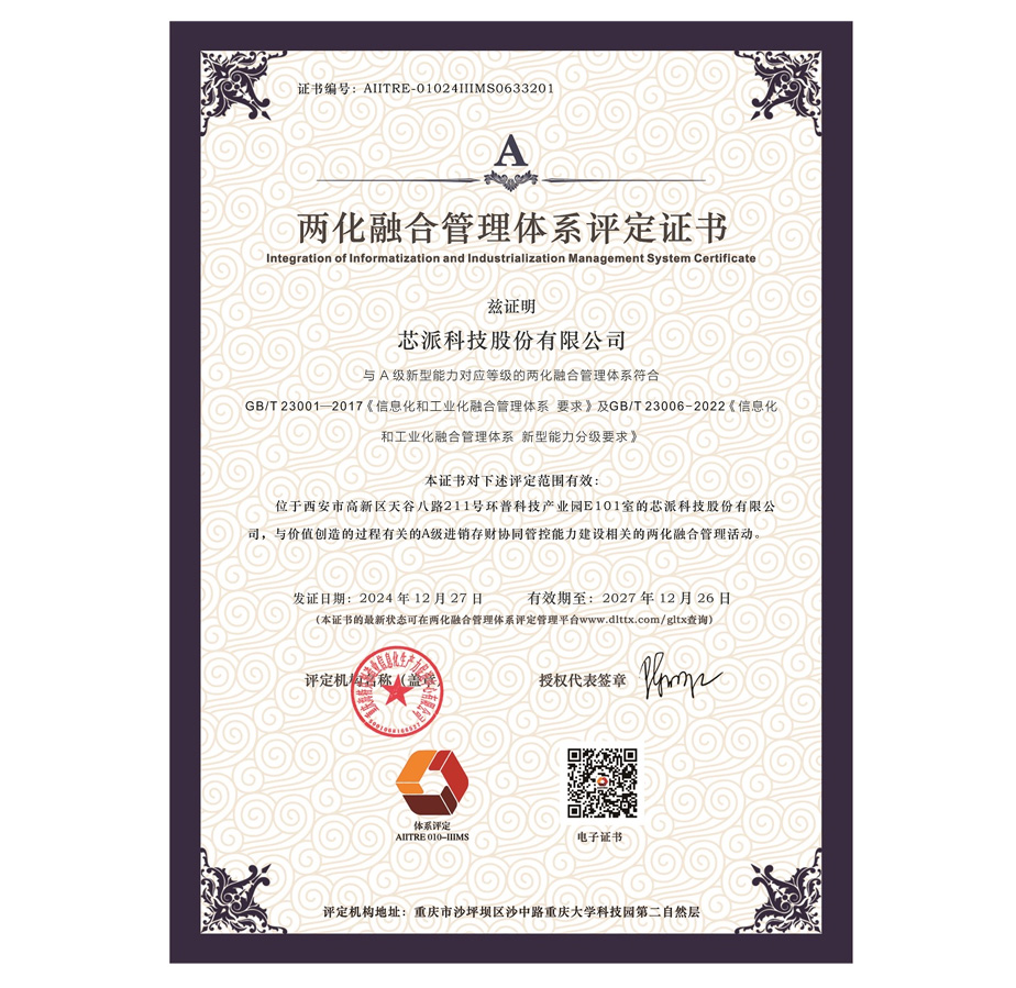 此次順利獲證,是評定機構(gòu)對公司在兩化融合工作方面給予的充分肯定和認可。未來,芯派科技將嚴(yán)格落實“兩化融合”工作各項要求,持續(xù)推進信息化、數(shù)字化、智能化建設(shè),為公司戰(zhàn)略管理提供有效的決策支持信息,為公司推進高質(zhì)量發(fā)展注入新的動能。