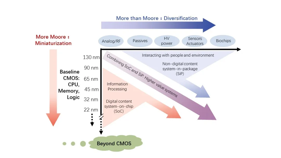 幸運的是,每當摩爾定律被唱衰將走到盡頭,總會激發(fā)出科學(xué)家和工程師們創(chuàng)新構(gòu)想,提出力挽狂瀾的突破性技術(shù),將看似走向終結(jié)的摩爾定律以“后摩爾定律”的形式延續(xù)下去?!昂竽柖伞钡膶嵸|(zhì)是,它除了會延續(xù)摩爾定律對集成度、性能的追求外,還會利用更多的技術(shù),例如模擬/射頻、高壓功率電源、MEMS傳感器、生物芯片技術(shù)及系統(tǒng)級封裝(SiP)等三維集成技術(shù),以提供具有更高附加值的系統(tǒng)。